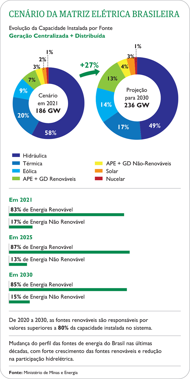 O Brasil é apontado como uma potência mundial na geração de energia a partir de fontes renováveis, com 84% de sua matriz elétrica oriunda de sistemas sustentáveis