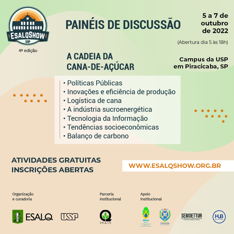 De 5 a 7 de outubro de 2022, a Escola Superior de Agricultura "Luiz de Queiroz" (Esalq/USP) realizará a 4ª edição do Esalqshow, evento que neste ano será presencial e terá como tema a cadeia produtiva da cana-de-açúcar.