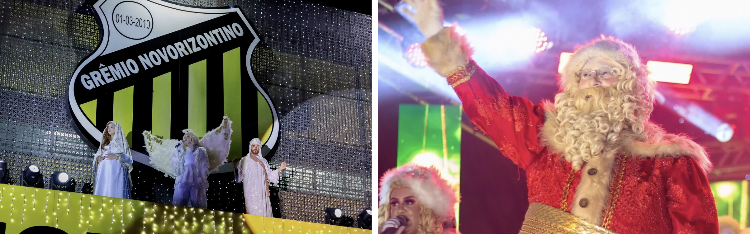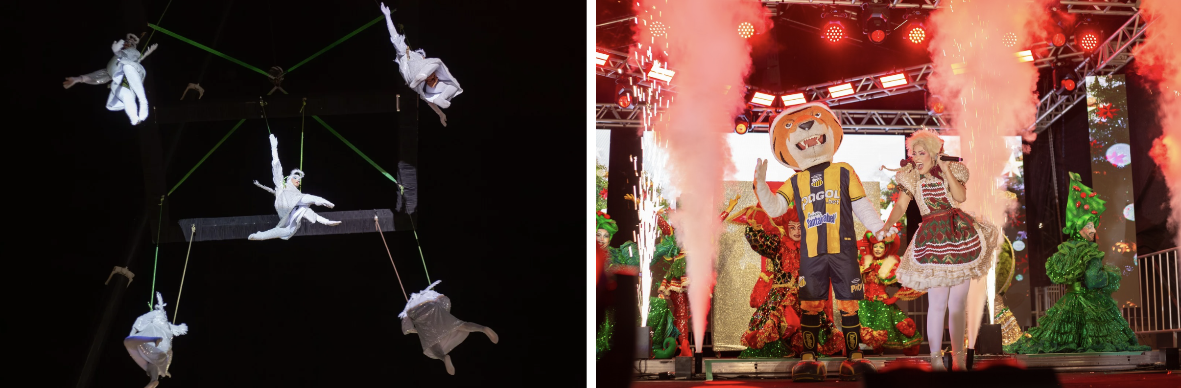 A grandiosa apresentação da Cia Criativa encantou o público ao levar anjos para o céu, em uma coreografia emocionante. O Tigrão fez sua participação especial e animou ainda mais o público presente. E quando o Papai Noel surgiu em seu trenó iluminado, sob luzes cintilantes e fogos de artifício, o público vibrou com a força de um momento verdadeiramente mágico. A cena de Maria e José, acompanhados pelos anjos, foi outro instante de profunda emoção, embalado por músicas que tocaram o coração de todos.