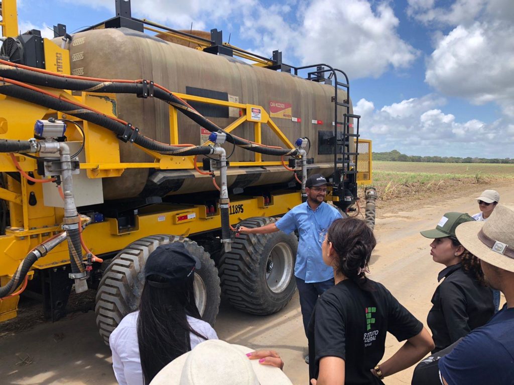 Durante a programação, os estudantes conheceram o manejo e a estrutura de irrigação utilizados pela empresa, com destaque para a aplicação de vinhaça localizada, o plantio mecanizado com bisturi e a colheita mecanizada.