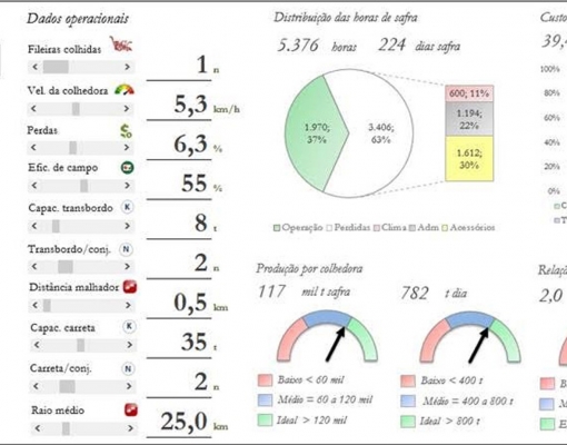 Na sequência são inseridos os dados técnicos/operacionais dos equipamentos envolvidos nos subsistemas de corte, transbordo, transporte e apoio. Com base nesses dados são realizados os cálculos das capacidades operacionais, de campo ou de produção e de indicadores de desempenho, tais como a quantidade de cana colhida por máquina; relação transbordo por colhedora; distância percorrida por caminhão na safra, entre outros. “A razão entre o ritmo operacional e a capacidade operacional resulta, no caso do corte, no número necessário de colhedoras para atender à demanda industrial, desencadeando, por sua vez, a quantificação dos demais equipamentos envolvidos, número de conjuntos, encerrando-se a etapa do dimensionamento operacional.”