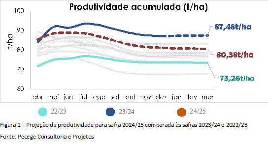 Figura 1 – Projeção da produtividade para safra 2024/25 comparada às safras 2023/24 e 2022/23