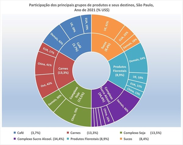 De acordo com os pesquisadores do IEA, José Alberto Angelo, Marli Dias Mascarenhas de Oliveira e Carlos Nabil Ghobril, o complexo sucroalcooleiro teve uma variação positiva de 0,5% em relação a 2020, sendo que o açúcar representou 86,4% do montante exportado e o álcool 13,6%. Já o complexo soja teve crescimento de 24,4% em 2021, sendo que 84,8% das exportações foram de soja em grãos.