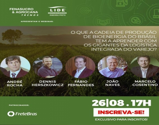 Webinar, que será realizado às 17h do dia 26 de agosto, terá a parceria do LIDE Ribeirão Preto e reunirá alguns dos mais importantes executivos dos setores de bioenergia, tecnologia e transporte e logística do Brasil