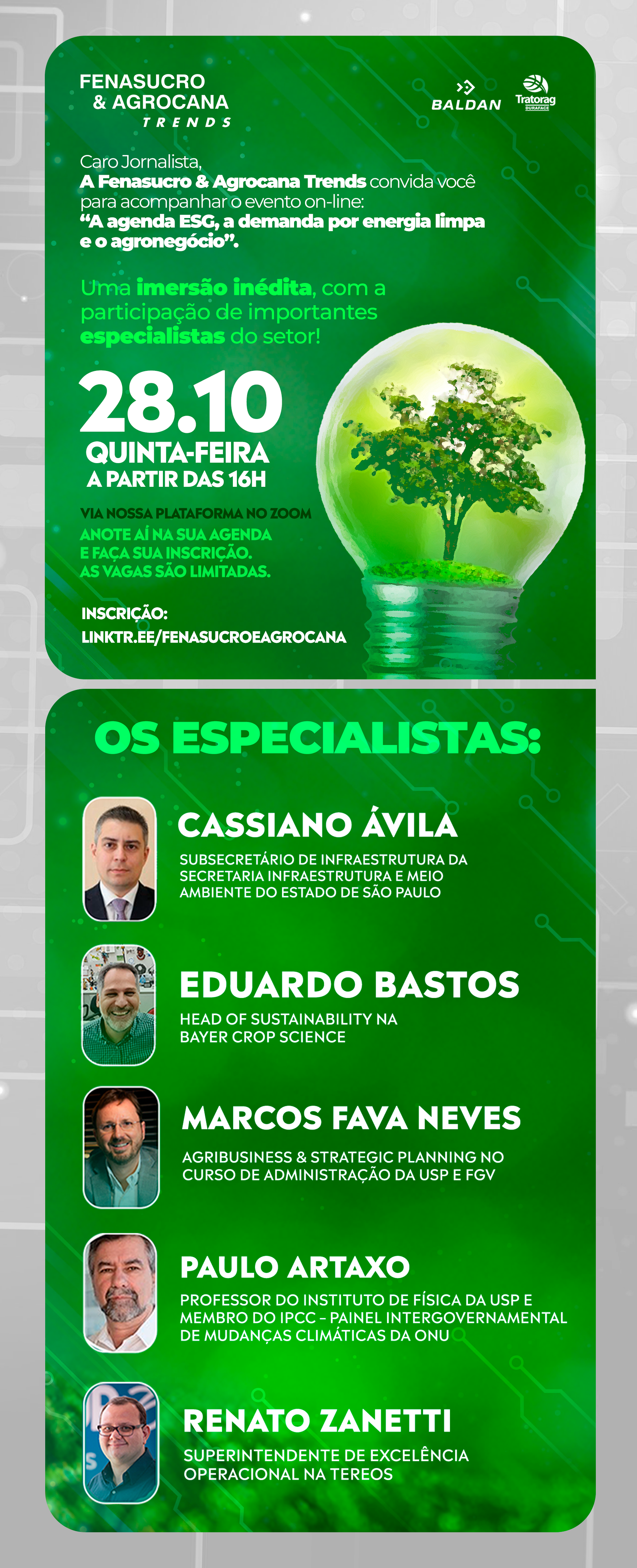 Entre os convidados está Paulo Artaxo, professor do Instituto de Física da Universidade de São Paulo (USP) e um dos líderes do Painel Intergovernamental sobre Mudanças Climáticas (IPCC). O pesquisador é uma das maiores referências mundiais sobre aquecimento global e vai debater o tema com Eduardo Bastos, que é head de sustentabilidade na Bayer Crop Science; com o subsecretário de Infraestrutura da Secretaria de Meio Ambiente e Infraestrutura do Estado de São Paulo, Cassiano Ávila; e com o superintendente de Excelência Operacional da Tereos, Renato Zanetti. A mediação do evento será de Marcos Fava Neves, consultor e professor da FEA-USP Ribeirão Preto e da FGV.
