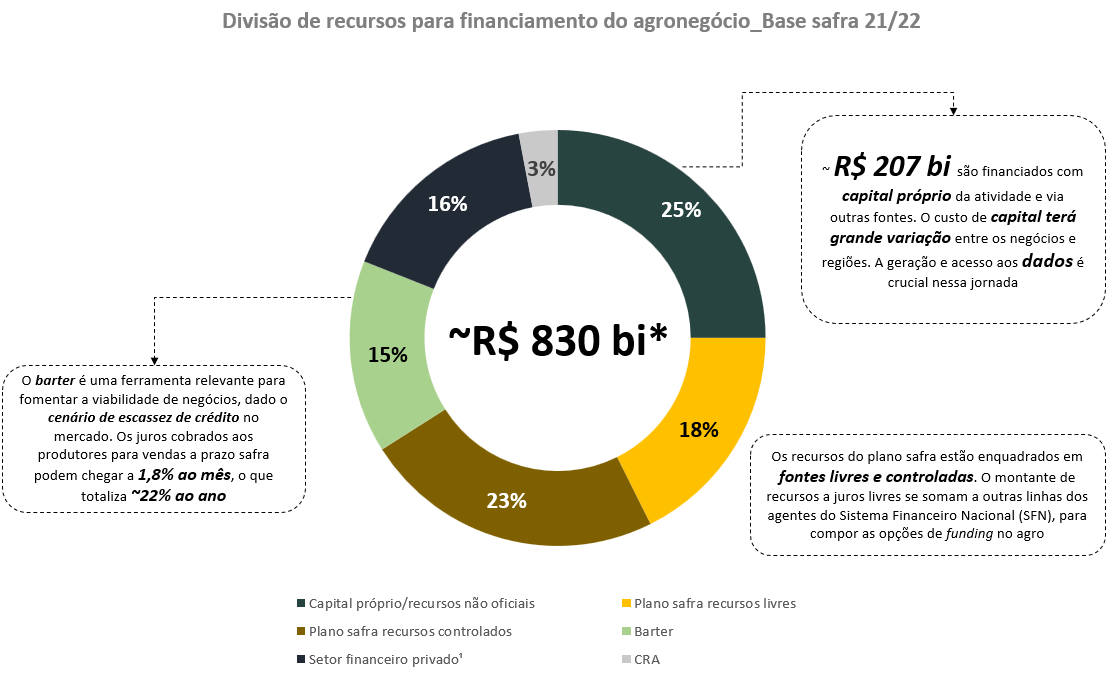 O montante de recursos necessários para financiar a agricultura está estimado em R$ 830 bilhões atualmente. Desse total, 41% estão englobados em diferentes linhas do plano safra, a recursos livres e controlados. Os agentes comerciais, sejam provedores de insumos, comerciantes de produtos, processadores, ou cooperativas, representam aproximadamente 15% to total, principalmente via a modalidade do barter. Outras fontes vindas de agentes privados representam 16% do total, o caixa do produtor é estimado em financiar quase ¼ da necessidade de recursos e o mercado de capitais, ainda tímido, representa cerca de 3%.