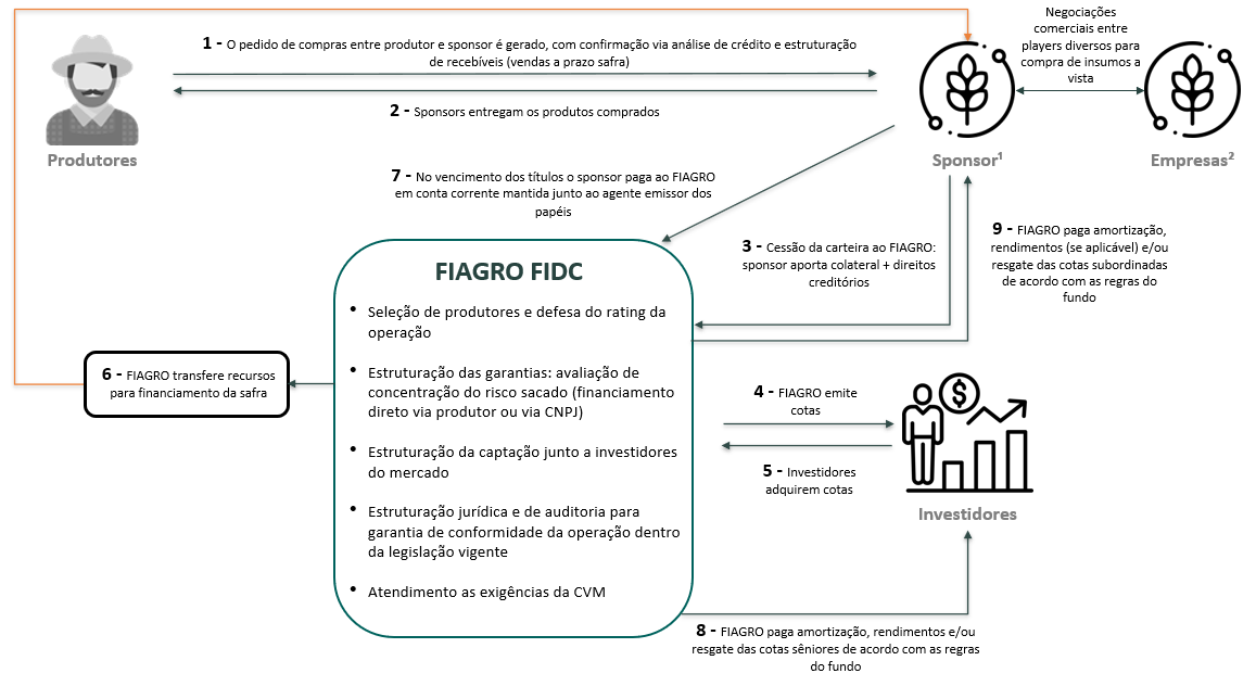 O foco desse artigo está na análise de potencial de competitividade de operações de FIAGRO FIDC, com emissão por “sponsor” corporativo, que fica responsável pelas cotas subordinadas do fundo (em garantia, ou “colateral”, por certo nível de perdas por inadimplência) de carteira de recebíveis dos seus produtores. Esse perfil de operação é ilustrado conforme modelo abaixo: