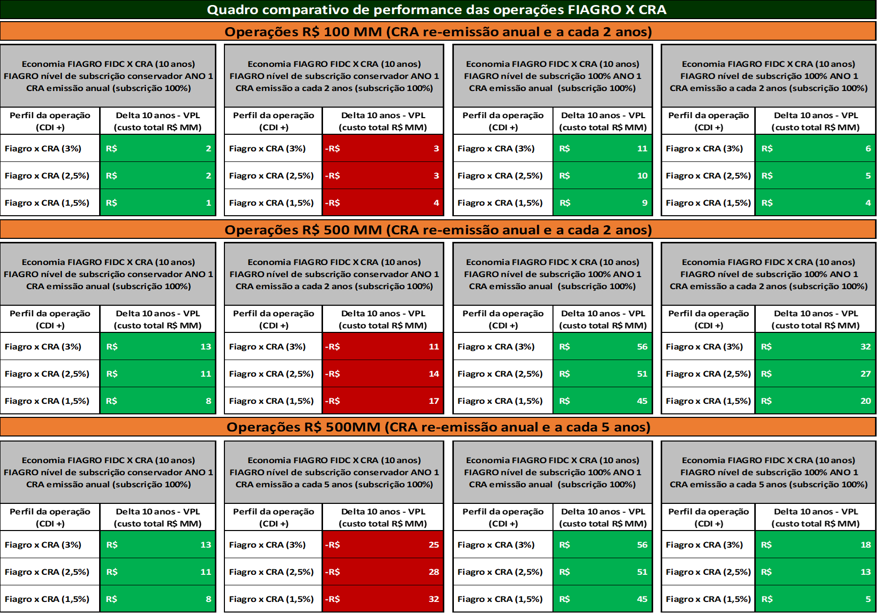 As tabelas abaixo mostram comparativos entre alternativas de produtos de securitização de carteira de recebíveis na estrutura de CRA ou FIAGRO FIDC, conforme algumas premissas chave do diferencial de custo acumulado em dez anos de operações. O CRA foi a opção selecionada para o comparativo devido a representatividade no universo de operações estruturadas para o financiamento do agronegócio nacional. As principais premissas que influenciam a análise são: