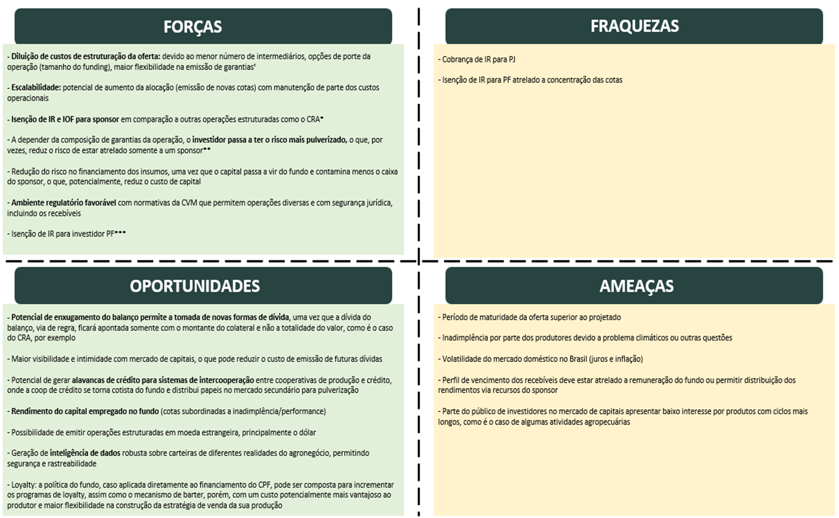 Nesse sentido, desenhamos uma análise SWOT (Pontos Fortes, Fracos, Oportunidades e Ameaças) sobre a operação do FIAGRO FIDC, para o cenário de operações com perfil compatível ao apresentado nesse artigo: