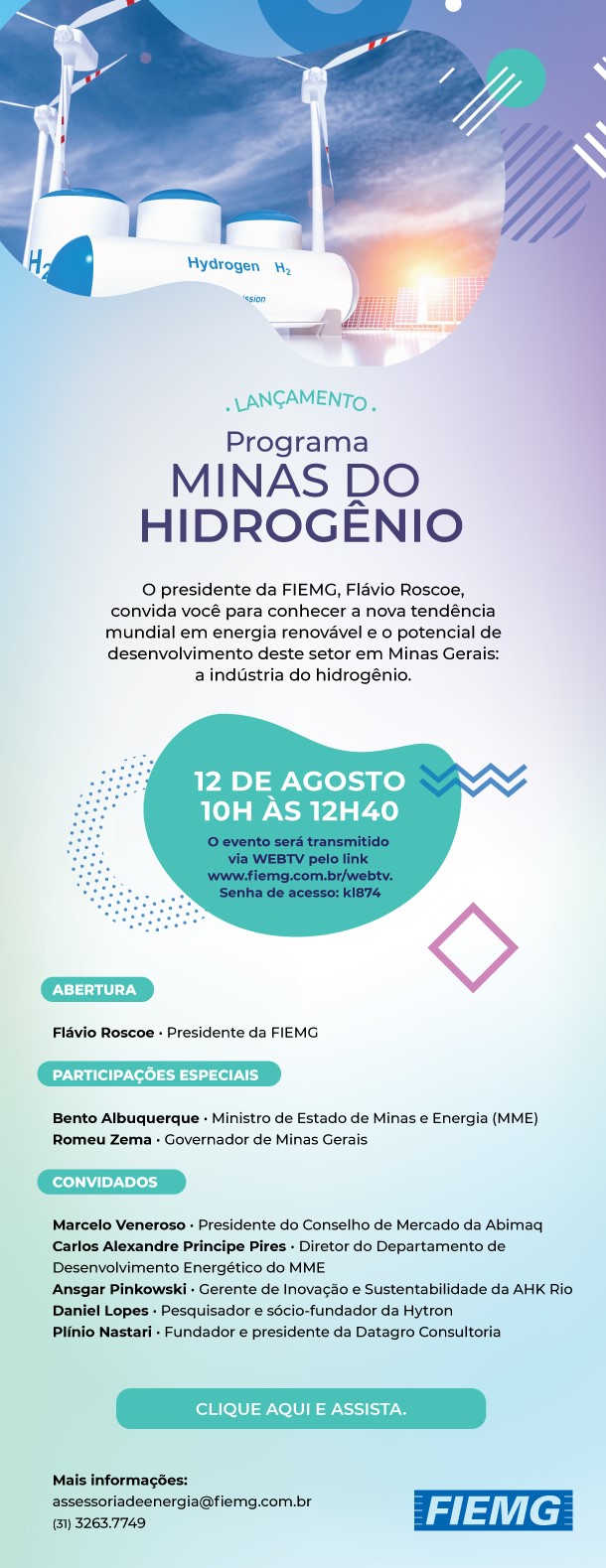 Será no próximo dia 12/08 das 10h às 12h40 o lançamento virtual do programa “Minas do hidrogênio”, pela Federação das Indústrias de Minas Gerais (FIEMG). O evento contará com a presença do Ministro das Minas e Energia, Bento Albuquerque, e o governador do estado, Romeu Zema.