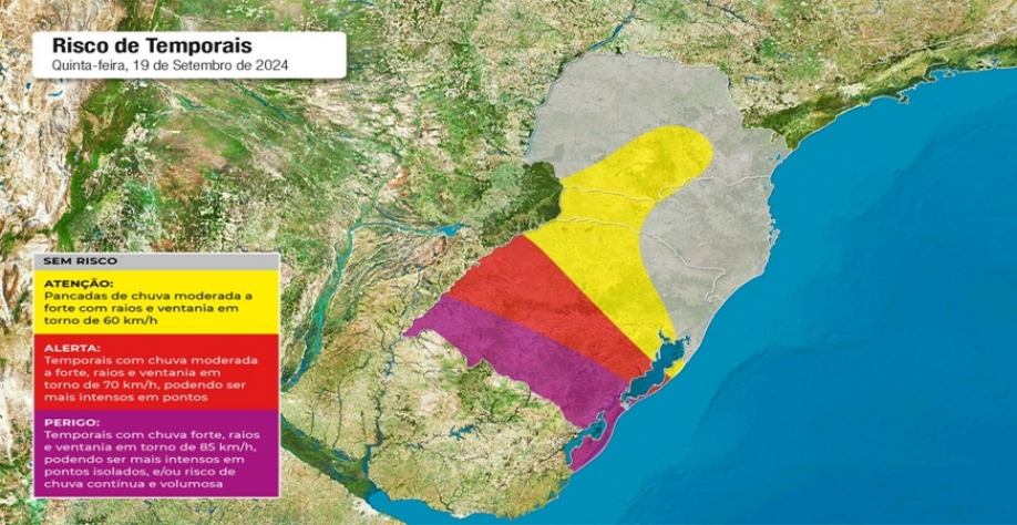 De acordo com a Climatempo, o cavado será o principal responsável por manter o cenário instável na região Sul. Já na sexta-feira (20), o avanço de uma nova frente fria reforçará as instabilidades, aumentando o risco de temporais no Rio Grande do Sul, Santa Catarina e Paraná.