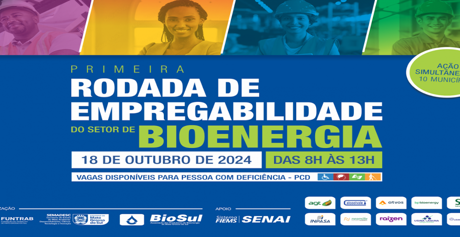 Campo Grande, 09 de outubro de 2024 - Em uma ação inédita, a Fundação de Trabalho de Mato Grosso do Sul (Funtrab) e a Associação dos Produtores de Bioenergia do Estado (Biosul) realizam, no dia 18 de outubro, a 1ª Rodada da Empregabilidade voltado ao setor de bioenergia. O evento ocorrerá simultaneamente em 11 municípios: Aparecida do Taboado, Caarapó, Campo Grande, Dourados, Maracaju, Nova Alvorada do Sul, Nova Andradina, Rio Brilhante, Sidrolândia e Sonora.