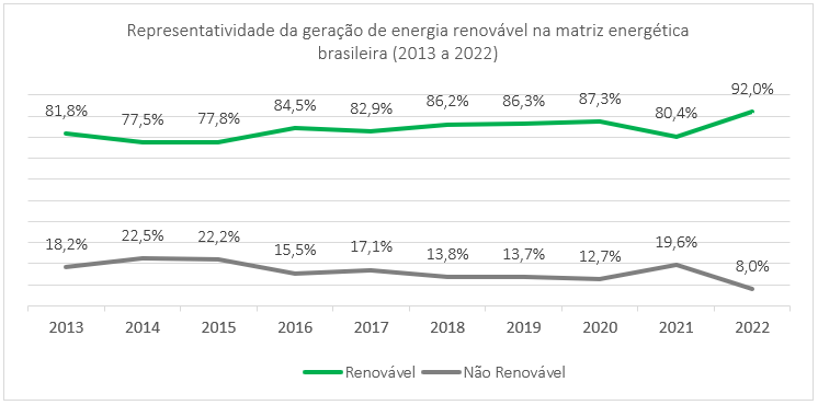 O ano de 2022 foi marcado pelo avanço da energia renovável no Brasil. O país ultrapassou o marco de 92% de participação de usinas hidrelétricas, eólicas, solares e de biomassa no total gerado pelo Sistema Interligado Nacional -- SIN, o maior percentual dos últimos 10 anos.