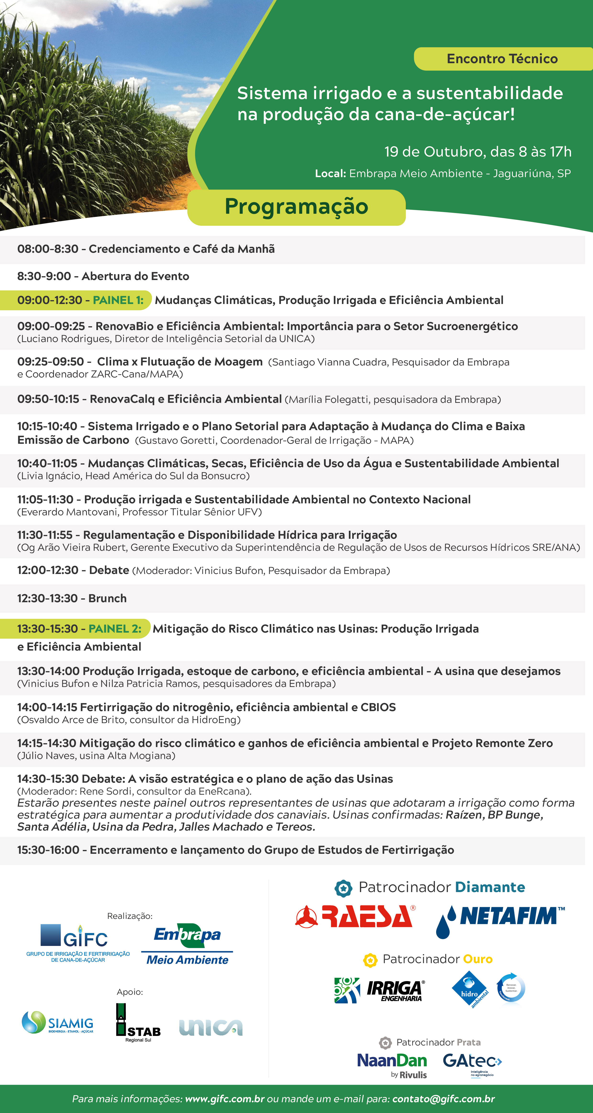 O Grupo de Irrigação e Fertirrigação de Cana-de-açúcar (GIFC), em parceria com a Embrapa Meio Ambiente, realiza em 19 de outubro de 2023 em Jaguariúna, SP, o Encontro "Sistema Irrigado e a Sustentabilidade na Produção da Cana-de-Açúcar". As vagas são limitadas e as inscrições vão até 31 de agosto (1º lote) e a partir de 1º de setembro começam as vendas do 2º lote.