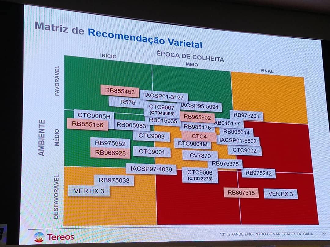Segundo Dinardo, o processo de escolha de variedades começa com a obtenção de dados da experimentação agrícola das instituições, introdução e avaliação agronômica/fitopatológica dos novos materiais nos campos de competição varietal realizados em ambientes de produção mais representativos da Tereos. Deles saem as informações de quais materiais são mais promissores e que merecem ser multiplicados. Entre as variedades mais plantadas pelo Grupo estão: RB975952; RB975242; CTC9002; RB975201 e CV7870.