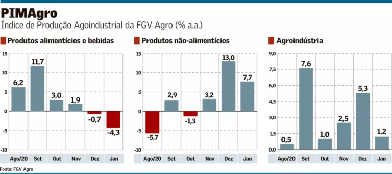 No período de 12 meses encerrado em janeiro, o PIMAgro acumulou queda de 1,1%. Como o desempenho no primeiro mês de 2021 foi positivo, realça a mesma análise, é possível concluir que a agroindústria brasileira está acelerando. Fatores como a volta do auxílio emergencial, mesmo em valores mais baixos, o comportamento da inflação dos alimentos e o recrudescimento da pandemia no Brasil definirão se essa aceleração ganhará ou não tração.