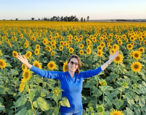Ela e o marido ingressaram na agricultura em 2017. Dois anos depois, resolveram plantar girassóis na safra de inverno, também conhecida como segunda safra ou safrinha. "Como não tínhamos experiência com girassol, buscamos informações de diversas fontes para ter mais conhecimento técnico sobre a cultura", diz a agricultora.