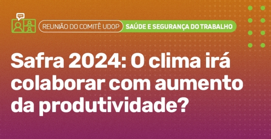 Na segunda-feira (19), às 10h (horário de Brasília), a UDOP - União Nacional da Bioenergia realizará a reunião on-line de seu Comitê de Saúde e Segurança do Trabalho. O tema central será "Safra 2024: O clima irá colaborar com o aumento da produtividade?".