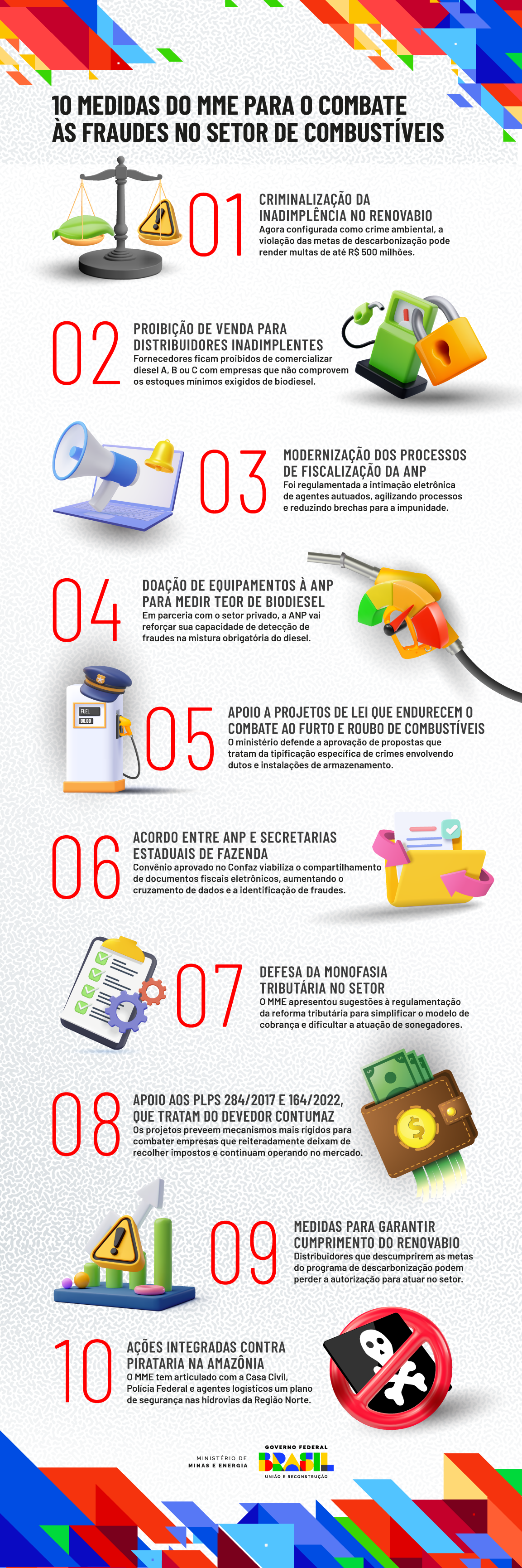 OMinistério de Minas e Energia (MME) lidera um conjunto de ações voltadas ao combate de fraudes e práticas criminosas no setor de combustíveis. O pacote reúne dez medidas implementadas desde 2023 sob articulação do ministro de Minas e Energia, Alexandre Silveira, e já consideradas pelo Governo Federal como um marco na construção de um mercado mais seguro, justo e eficiente para os consumidores brasileiros.