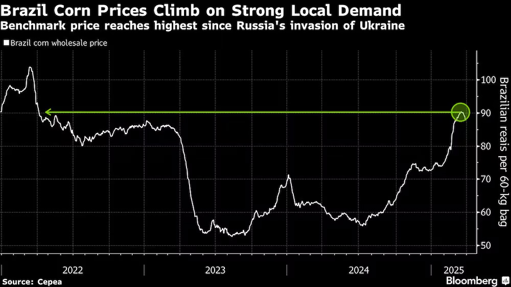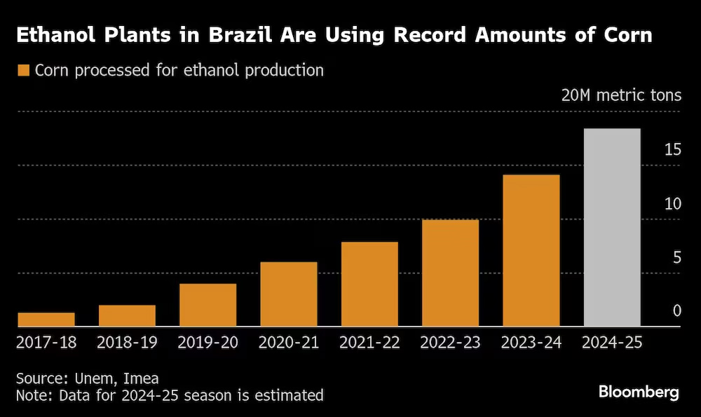 Os preços da commodity atingiram recentemente o maior nível desde 2022 no país, já que as usinas de etanol devem processar uma quantidade recorde de grãos nesta temporada.