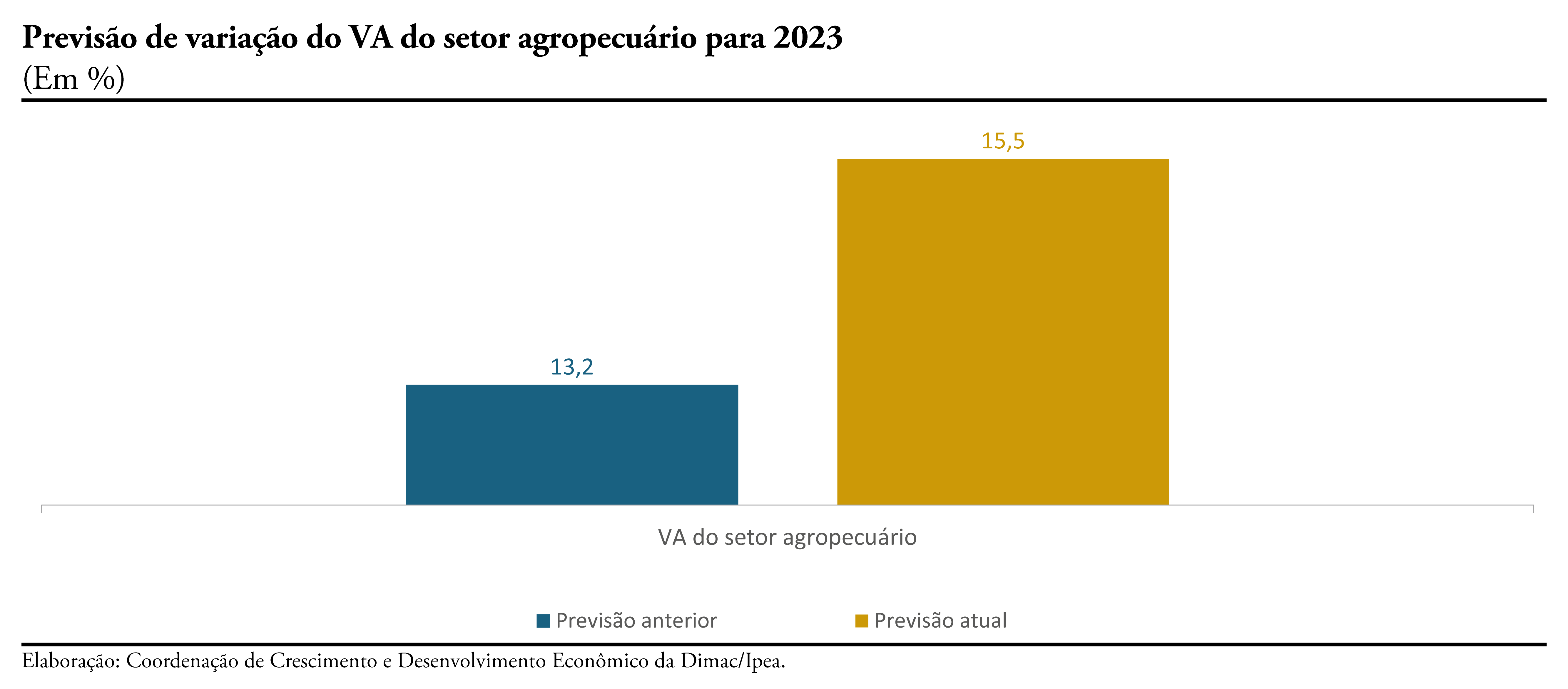 O Instituto de Pesquisa Econômica Aplicada (Ipea) divulgou, nesta segunda-feira (25), uma nova projeção do valor adicionado (VA) do setor agropecuário para 2023 e a primeira para 2024. Os pesquisadores revisaram de 13,2% para 15,5% a estimativa de crescimento para o setor, justificada pela alta acima do esperado no segundo trimestre, por revisões positivas das previsões do Instituto Brasileiro de Geografia e Estatística (IBGE) para as principais culturas da lavoura e pelo bom desempenho das produções de bovinos e aves. As projeções para o setor agropecuário já eram animadoras, mas seguem com cenário de melhora, conforme o gráfico abaixo: