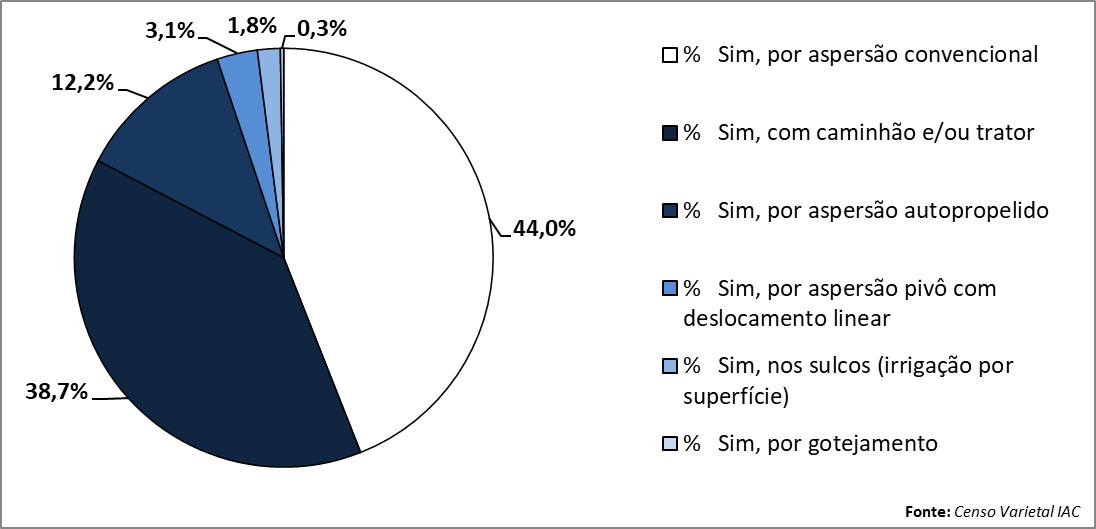 Entre os produtores que utilizarão irrigação/fertirrigação no plantio das áreas comerciais de 2025, o principal método utilizado será a aspersão convencional (44% da área irrigada), vindo a seguir a o uso de caminhão e/ou trator (39%) e a aspersão por autopropelido (12%), como pode-se observar na Figura 3.