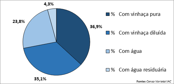 A pesquisa abordou também sobre o uso de vinhaça pura, vinhaça diluída, água e água residuária na irrigação ou fertirrigação nas áreas de plantio (Figura 4). Verificou-se que o uso da vinhaça pura (36,9%) ou da vinhaça diluída (35,1%) totalizou 72%. A aplicação de água foi reportada em 24% da área e a água residuária, 4%. Assim, verificou-se que o uso da vinhaça, seja diluída ou concentrada, se caracterizou pela maior proporção.