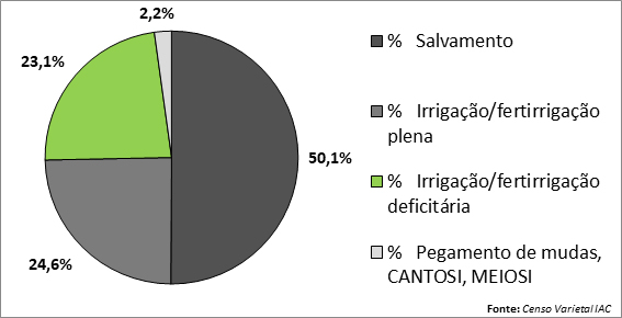 Em termos de estratégia de uso, a mais citada foi a de ‘salvamento’ (garantia stand de plantas), representando pouco mais de 50% da área de plantio (Figura 5). Importante salientar, que a irrigação por salvamento aqui mencionada tem o objetivo de garantir o stand de plantas na formação do canavial, este termo normalmente adotado para garantia de brotação da cana após o corte. Em seguida vieram, a irrigação/fertirrigação plena (25%) e a irrigação/fertirrigação deficitária (23%). Para para pegamento de mudas, o uso totalizou apenas 2% (Meiosi e Cantosi).