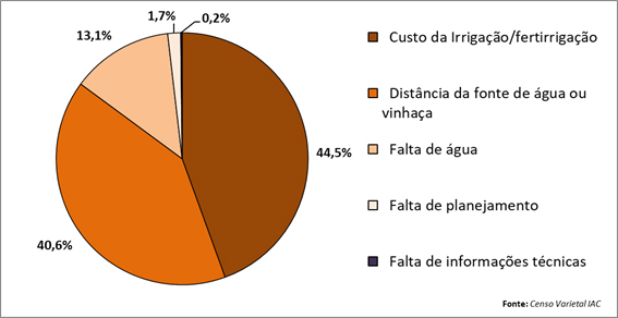 Em relação aos desafios encontrados para adoção da irrigação/fertirrigação nas empresas produtoras de cana-de-açúcar, foram relatados principalmente o custo seguido pela distância da área de produção da fonte de água (45%) ou vinhaça (41%) (Figura 6).
