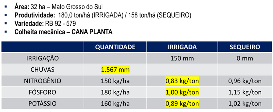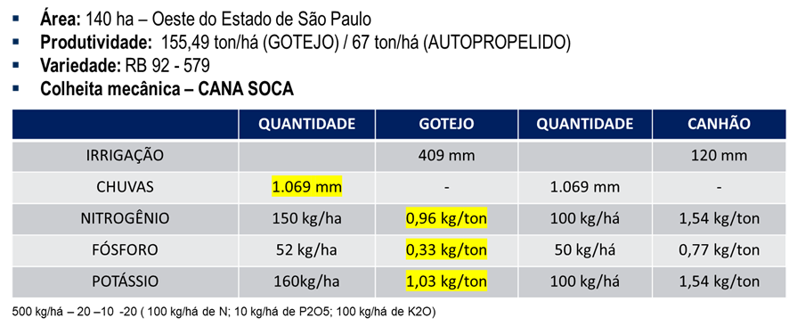 Nesse primeiro, realizado no estado do Mato Grosso do Sul, em um ano chuvoso, foram aplicados 150 kg de N; 180 kg de Fósforo e 160 kg de Potássio em canaviais irrigados por gotejamento, via fertirrigação e a mesma quantidade, via adubação sólida, em canaviais de sequeiro, observamos nos resultados que a eficiência, ou seja, a conversão kg de fertilizante para produzir 1 tonelada de colmo foi muito melhor no canavial irrigado. As plantas irrigadas precisaram de menos fertilizante para produzir 1 tonelada de colmo.