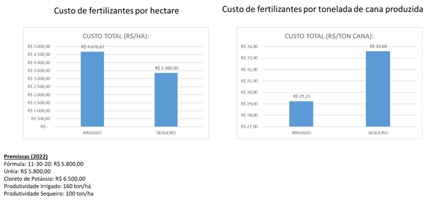 Além disso, outra característica importante em se utilizar a fertirrigação é a redução dos custos de produção. Podemos observar na simulação abaixo, que apesar de uma área irrigada por gotejamento apresentar um maior custo de fertilizantes por hectare, com o aumento de produtividade, observamos que o custo de produção (R$/ton de cana) é menor.