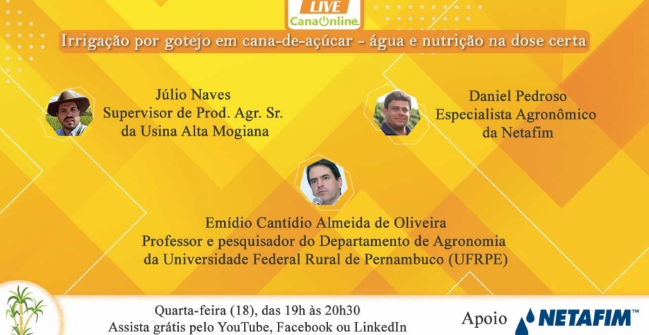 Este será o tema da próxima live da CanaOnline - “Irrigação por gotejo em cana-de-açúcar - água e nutrição na dose certa”, que acontece em 18 de maio, das 19h00 às 20h30.