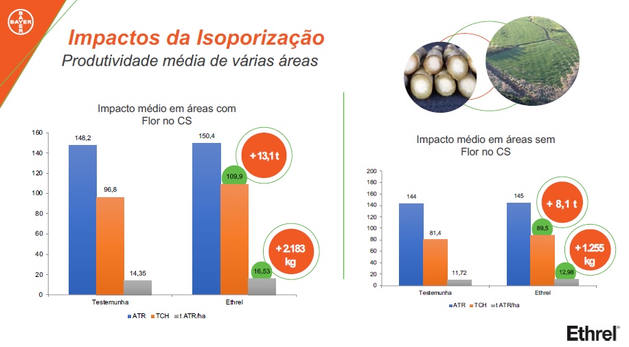 “Os dados de diversos experimentos conduzidos pelo país mostram que nas áreas com tendência ao florescimento e tratadas com Ehtrel é possível colher um excedente de 13,1 TCH quando comparada a testemunha. Sem falar no ganho de 2.183 kg de açúcar por hectare. Já em áreas onde não há florescimento, os ganhos médios alcançam 8,1 TCH e 1.255 kg de açúcar por hectare.”