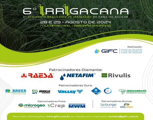 Em sua sexta edição, o Seminário Brasileiro de Irrigação e Fertilização de Cana-de-Açúcar (IRRIGANA), realizado pelo GIFC (Grupo de Irrigação e Fertirrigação em Cana-de-Açúcar), reunirá representantes de unidades bioenergéticas, produtores e produtoras rurais, pesquisadores e integrantes de empresas fornecedoras do setor, para discussão e troca de informações sobre a gestão eficiente do manejo da água e da fertirrigação em canaviais, visando o aumento de produtividade agrícola e longevidade das áreas. Este ano, o seminário será realizado nos dias 28 e 29 de agosto no Multiplan Hall, do Ribeirão Shopping, espaço de eventos localizado em Ribeirão Preto/SP e considerado um dos mais modernos e inovadores do país.