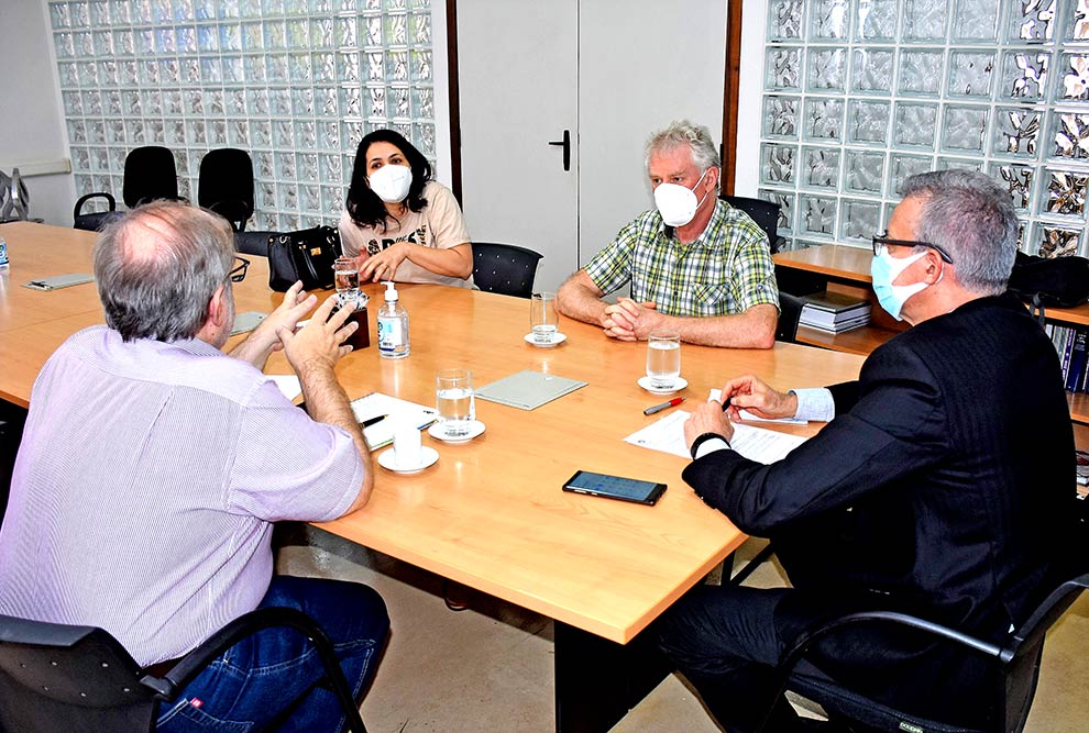 O reitor Antonio José de Almeida Meirelles, Tom Zé, recebe Lee Rybeck Lybd, diretor do Laboratório A2G está abrigado no CBMEG e na FEQ,