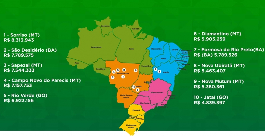 A região Centro-Oeste se destacou, com o estado de Mato Grosso à frente, abrigando 36 dos municípios mais produtivos do país. Sorriso (MT) ocupou a primeira posição, com uma produção de R$ 8,3 bilhões, seguido por São Desidério (BA), com R$ 7,8 bilhões.