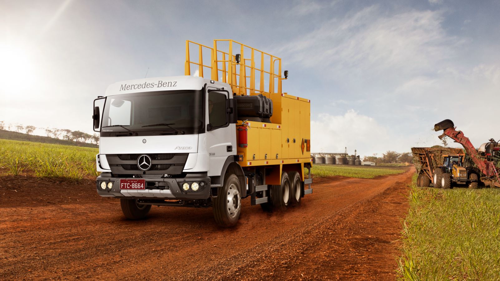 Na agricultura, o Atego 4x4 pode ser utilizado para diversos serviços de apoio, como borracheiro, oficina para suporte a máquinas no meio da plantação, tanque, bombeiro e outros.