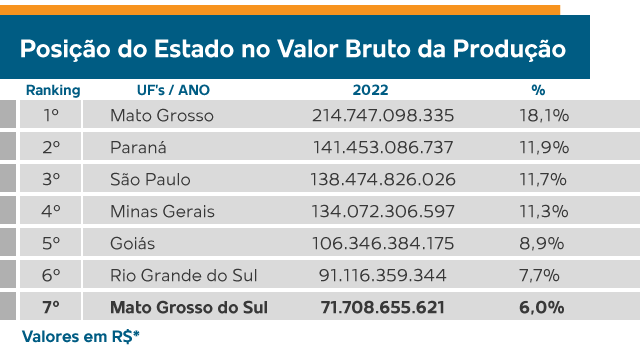O VBP (Valor Bruto da Produção Agropecuária) de Mato Grosso do Sul deve fechar 2022 em R$ 71,7 bilhões. A previsão é do Ministério da Agricultura, em levantamento divulgado recentemente pela área econômica da pasta. O volume mantém o Estado na sétima colocação no País, no ranking de tudo o que a agropecuária produz.
