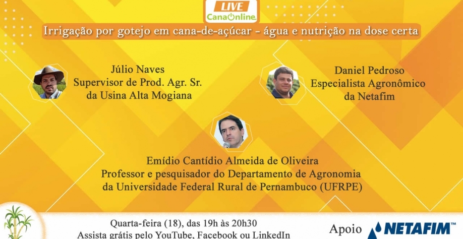A próxima live da CanaOnline - “Irrigação por gotejo em cana-de-açúcar - água e nutrição na dose certa”, acontecerá em 18 de maio, das 19h00 às 20h30.