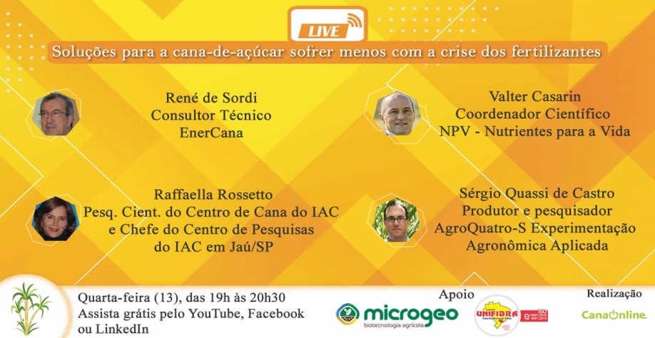 Nesta quarta, 13, tem a live: “Soluções para a cana-de-açúcar sofrer menos com a crise dos fertilizantes “