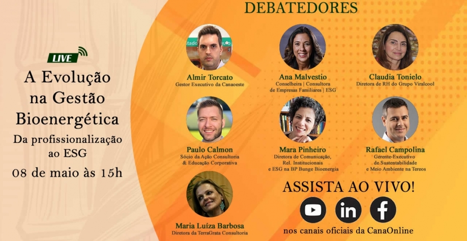 Nesta quarta-feira, 8 de maio, tem a live: A Evolução na Gestão Bioenergética - Da profissionalização ao ESG