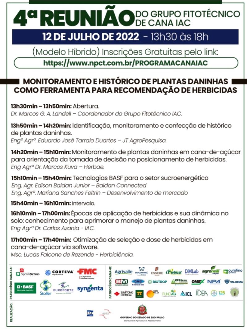 Nesta terça-feira 12 de JULHO, a partir das 13:30 h acontecerá a 4ª Reunião do Grupo Fitotécnico IAC