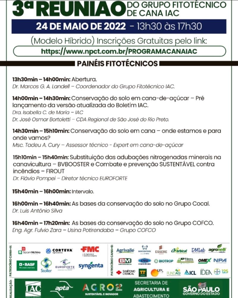 A reunião presencial acontece no Centro de Cana do IAC em Ribeirão Preto. As inscrições deverão ser realizadas através do link (https://lnkd.in/e8j_6FXF).