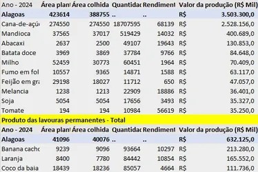 Enquanto as lavouras temporárias somaram R$ 3,5 bilhões, as lavouras permanentes somaram R$ 674,9 milhões em 2024. A banana lidera com folga, seguida pelo coco-da-baía e pelo abacaxi, que juntos representam a força da fruticultura alagoana.
