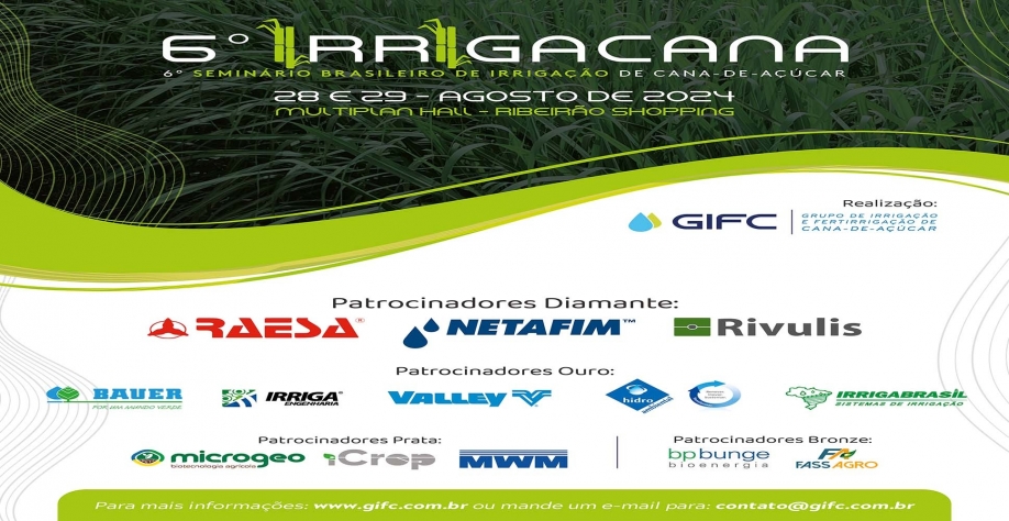 O Seminário Brasileiro de Irrigação e Fertilização de Cana-de-Açúcar (IRRIGANA), realizado pelo GIFC (Grupo de Irrigação e Fertirrigação em Cana-de-Açúcar), chega a 6ª edição e será realizado em Ribeirão Preto-SP, nos dias 28 e 29 de agosto de 2024