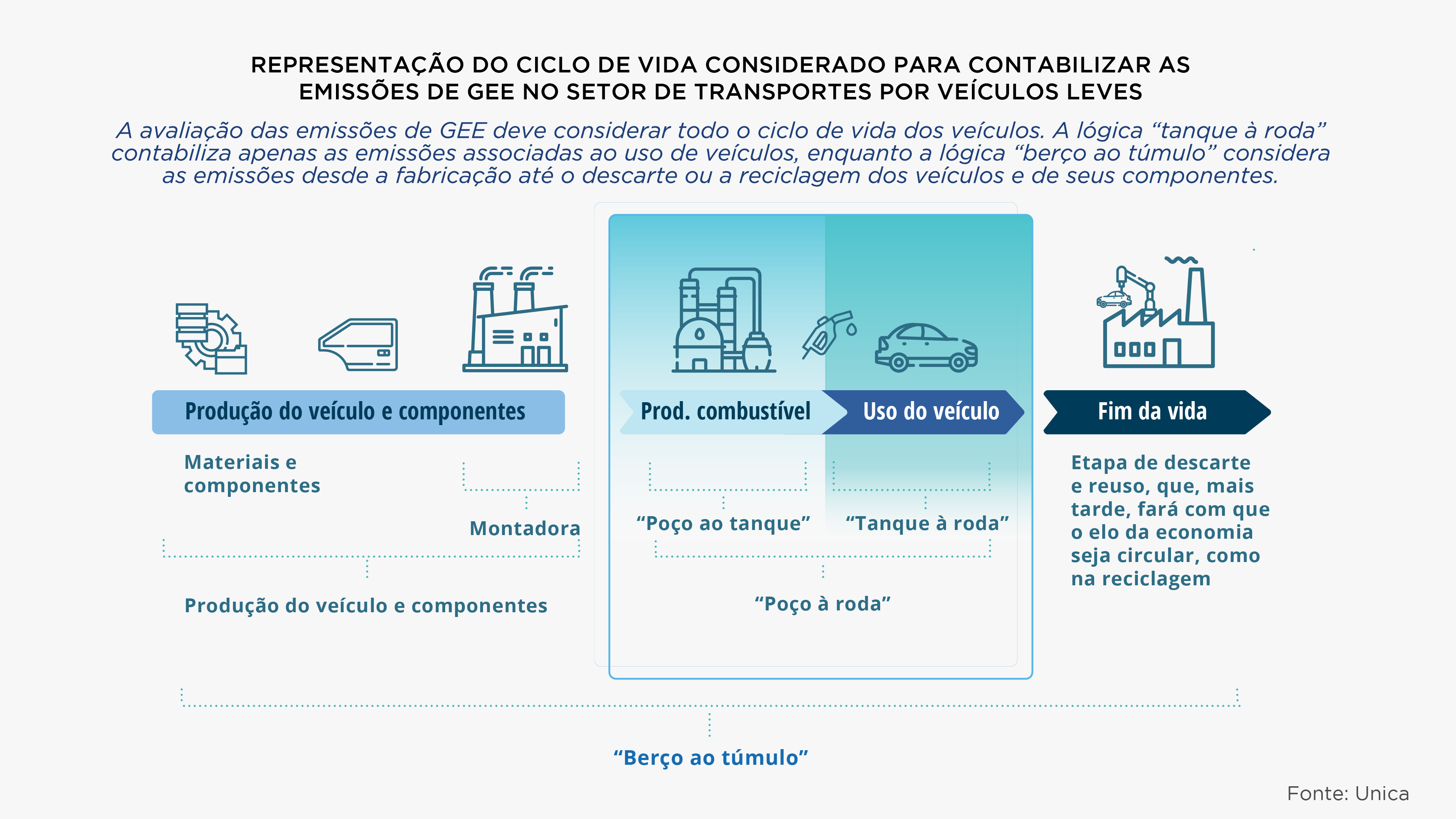 Por fim, tem-se o conceito sistêmico e completo trazido pelo ciclo “berço ao túmulo” (tradução livre do termo “cradle-to-grave”), em que são acrescidas às emissões do ciclo “poço à roda” aquelas geradas na fabricação, na montagem e no descarte dos veículos e de seus componentes.
