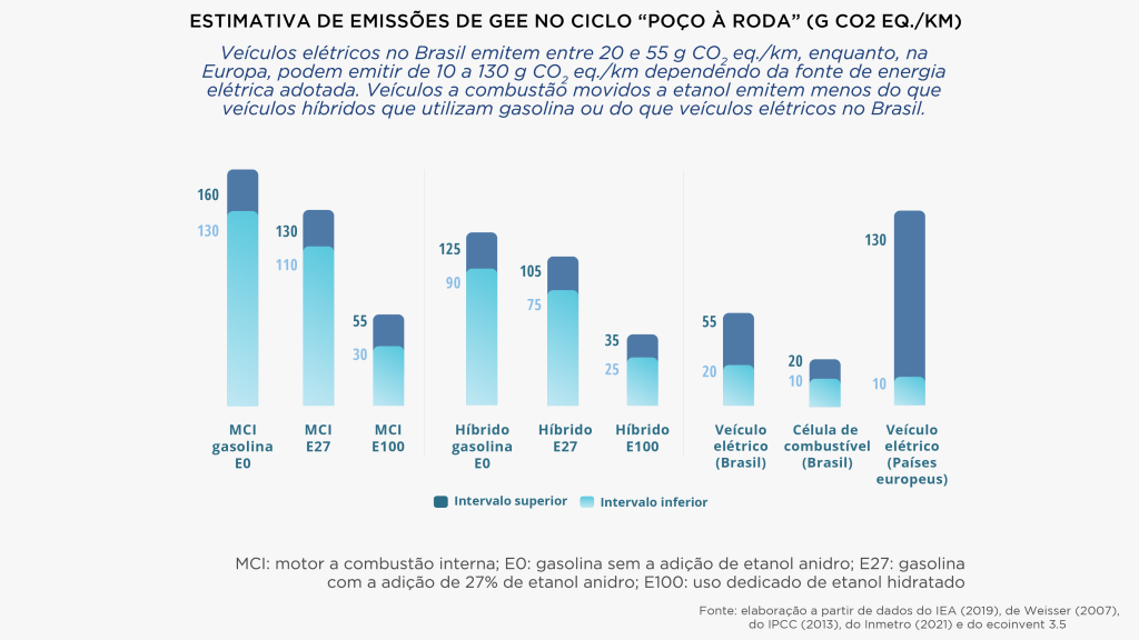 Mesmo no conceito mais restrito de “poço à roda”, já é possível entender a importância do uso de combustível de baixo carbono no resultado das emissões de GEE por quilômetro rodado. Veículos a combustão utilizando exclusivamente etanol (E100) no Brasil emitem, atualmente, entre 30 e 55 gramas de gás carbônico equivalente por quilômetro (g CO2 eq./km). Quando a tecnologia automotiva é substituída por veículos híbridos, esse nível de emissões com o uso do etanol reduz-se para um intervalo entre 25 e 35 g CO2 eq./km, em função da maior eficiência energética do veículo. Veículos elétricos consumindo energia da matriz brasileira também apresentam emissão reduzida, com valores variando de 20 a 55 g CO2 eq./km. Apenas a título de comparação, veículos elétricos na Europa podem emitir, atualmente, de 10 a 130 g CO2 eq./km – essa variação está relacionada, essencialmente, à fonte de energia elétrica adotada em cada país do continente europeu.