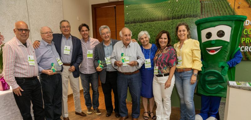 Stupiello com amigos recebendo o troféu Cana Substantivo Feminino, por seu empenho em abrir espaço para mulheres no setor