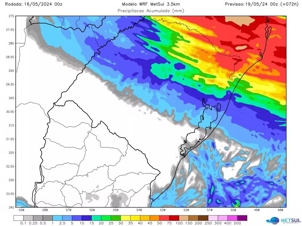 Já no Rio Grande do Sul, as chuvas seguem espalhadas pelo Estado. Nesta sexta-feira (17/5), os maiores volumes estarão na metade norte, onde estão as nascentes dos principais rios que sofrem os efeitos das cheias. As precipitações podem atingir de 50 a 100 milímetros em cidades do norte e do nordeste, especialmente da serra. Enquanto isso, no oeste e mais ao sul, o tempo segue seco.