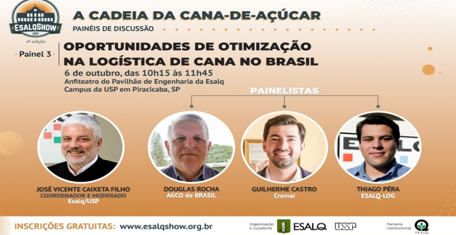 O tema do Painel 3 será Oportunidades de otimização na logística de cana no Brasil, agendado no dia 6, às 10h15, no Auditório do Pavilhão de Engenharia da Esalq/USP, instituição anfitriã do evento.